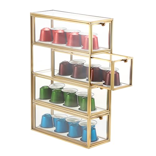 If you use pods for your coffee machine, forget lining them up in their original boxes. Instead, opt for something sleek like this glass pod organizer with a gold trim. I keep my Nespresso capsules in one of these, and it not only saves space but doubles as an aesthetic design element.